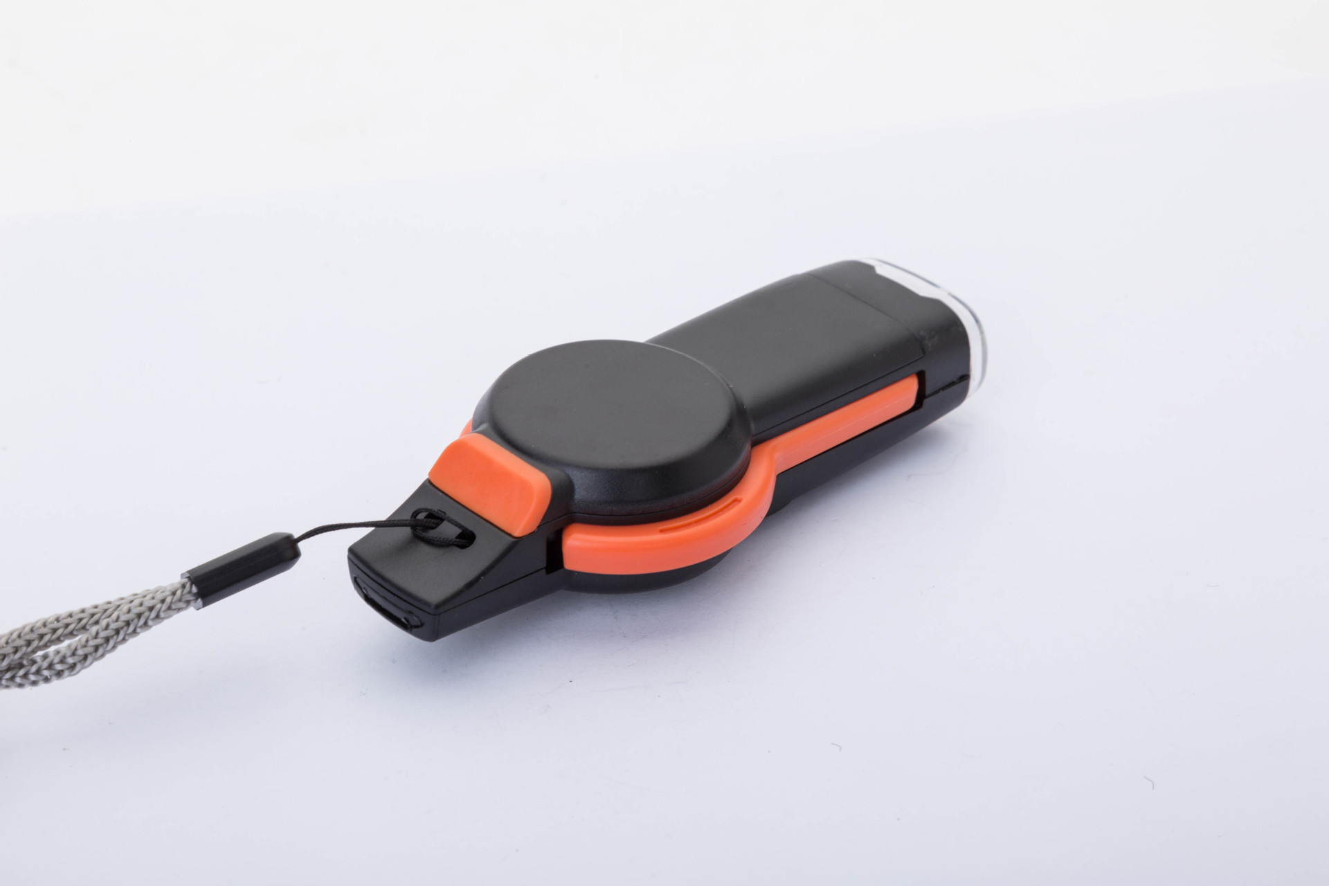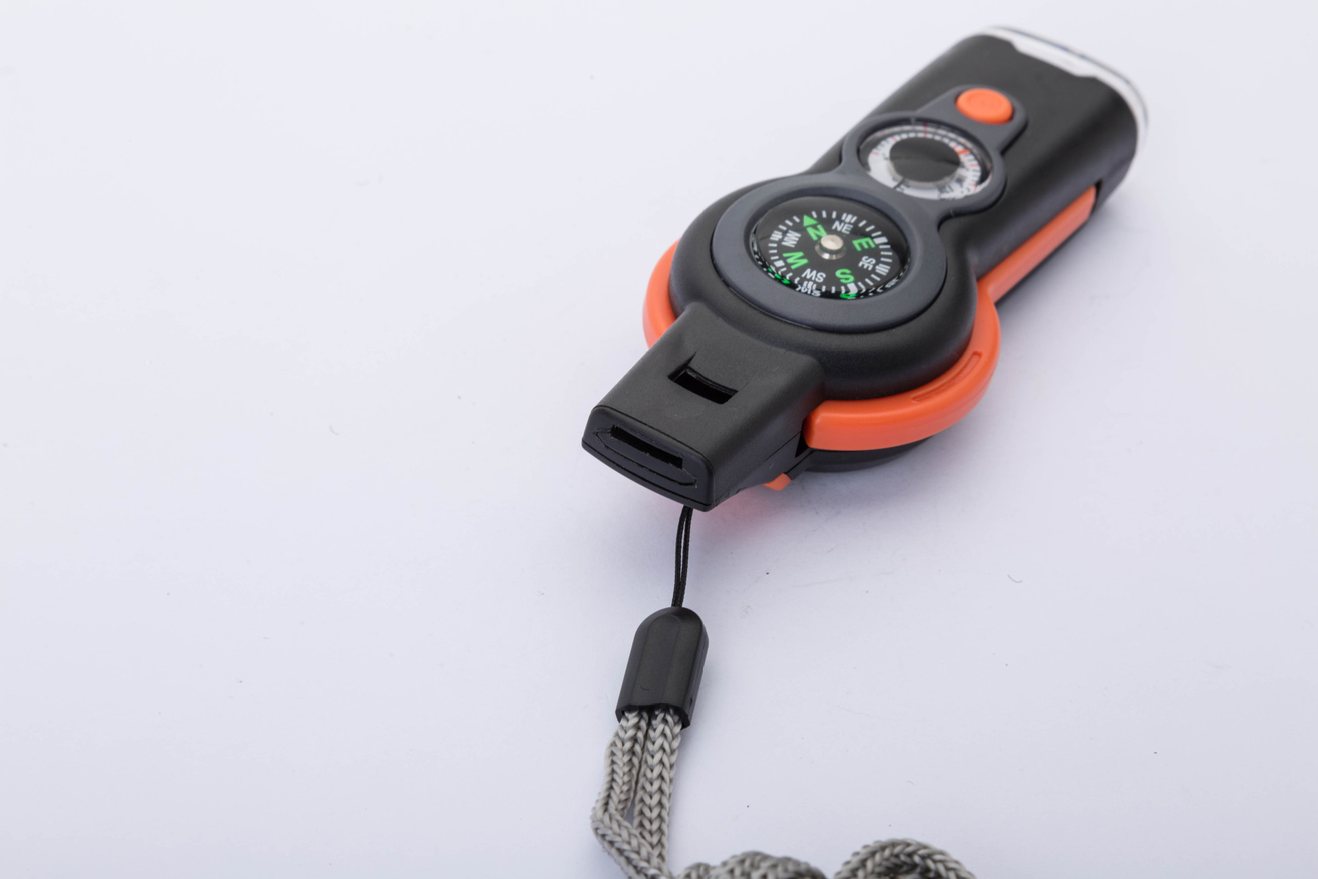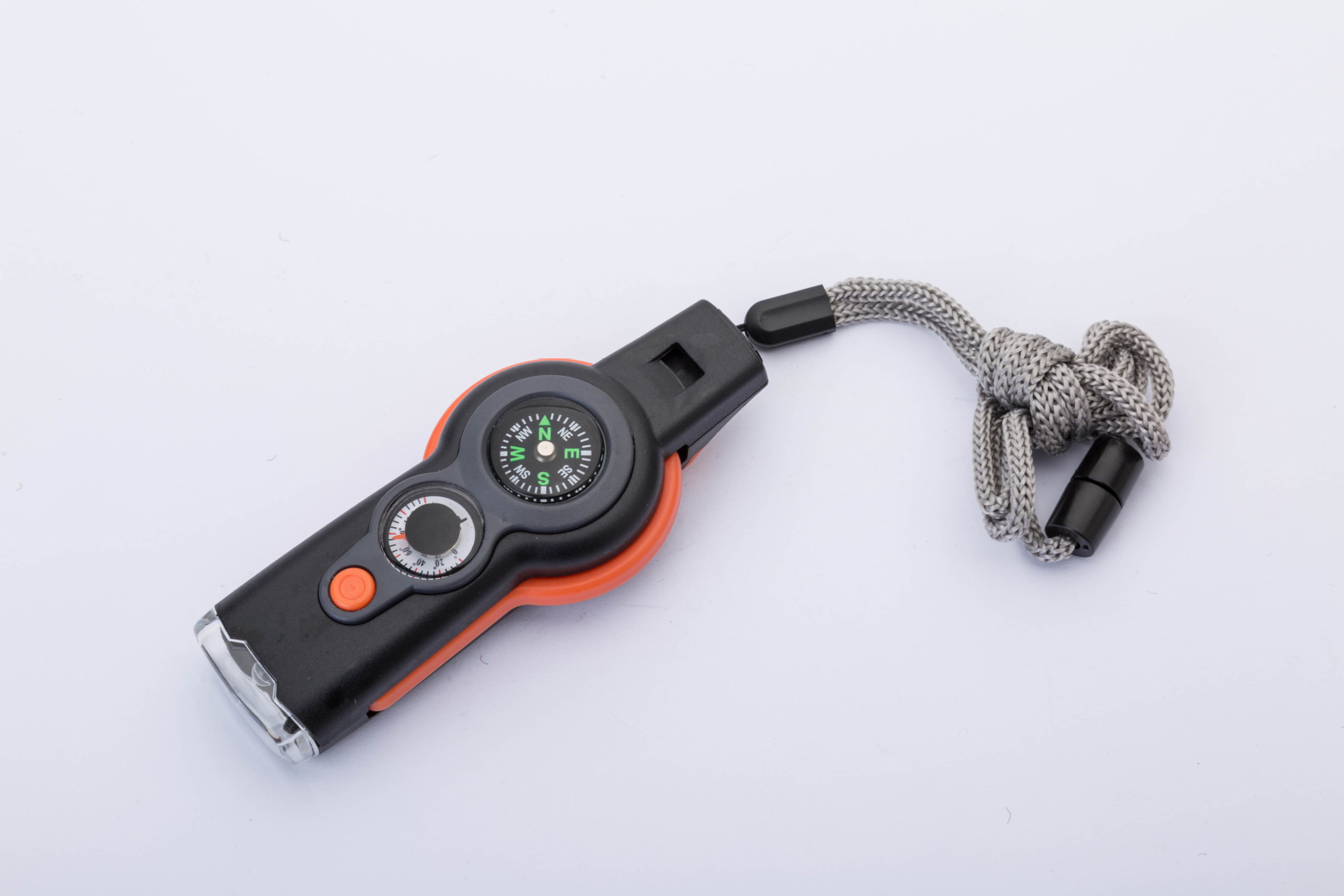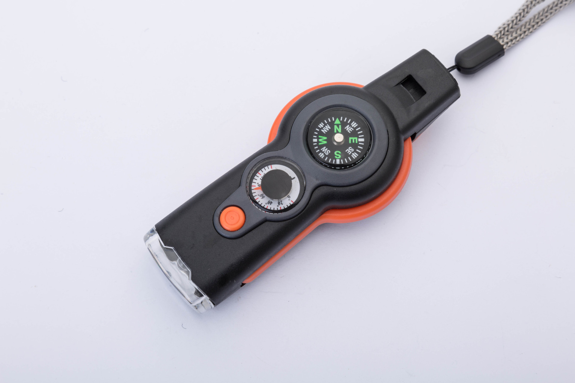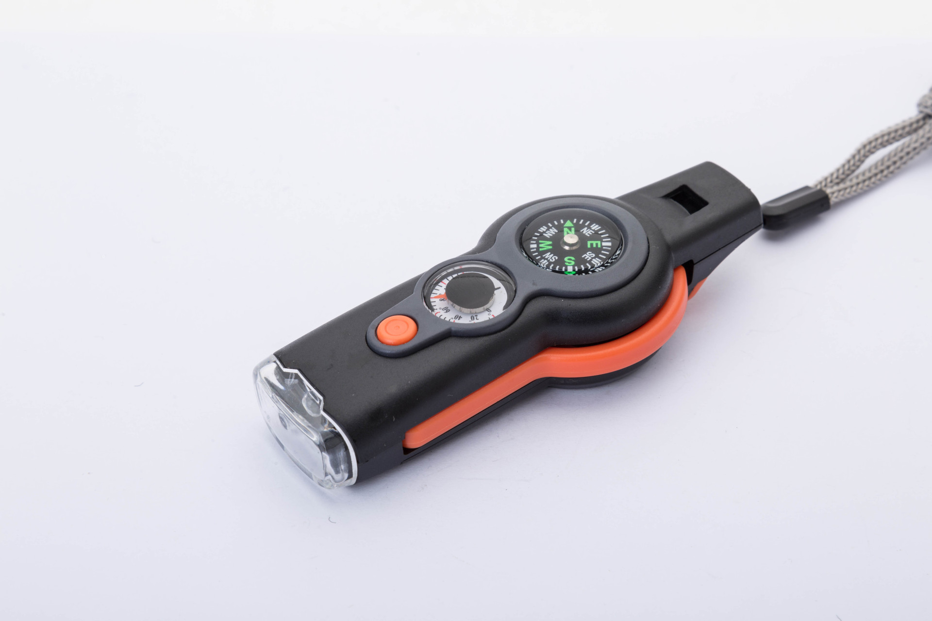Name: Safety whistle, compass and reflector, with LED light, thermometer, magnifier and lanyard.